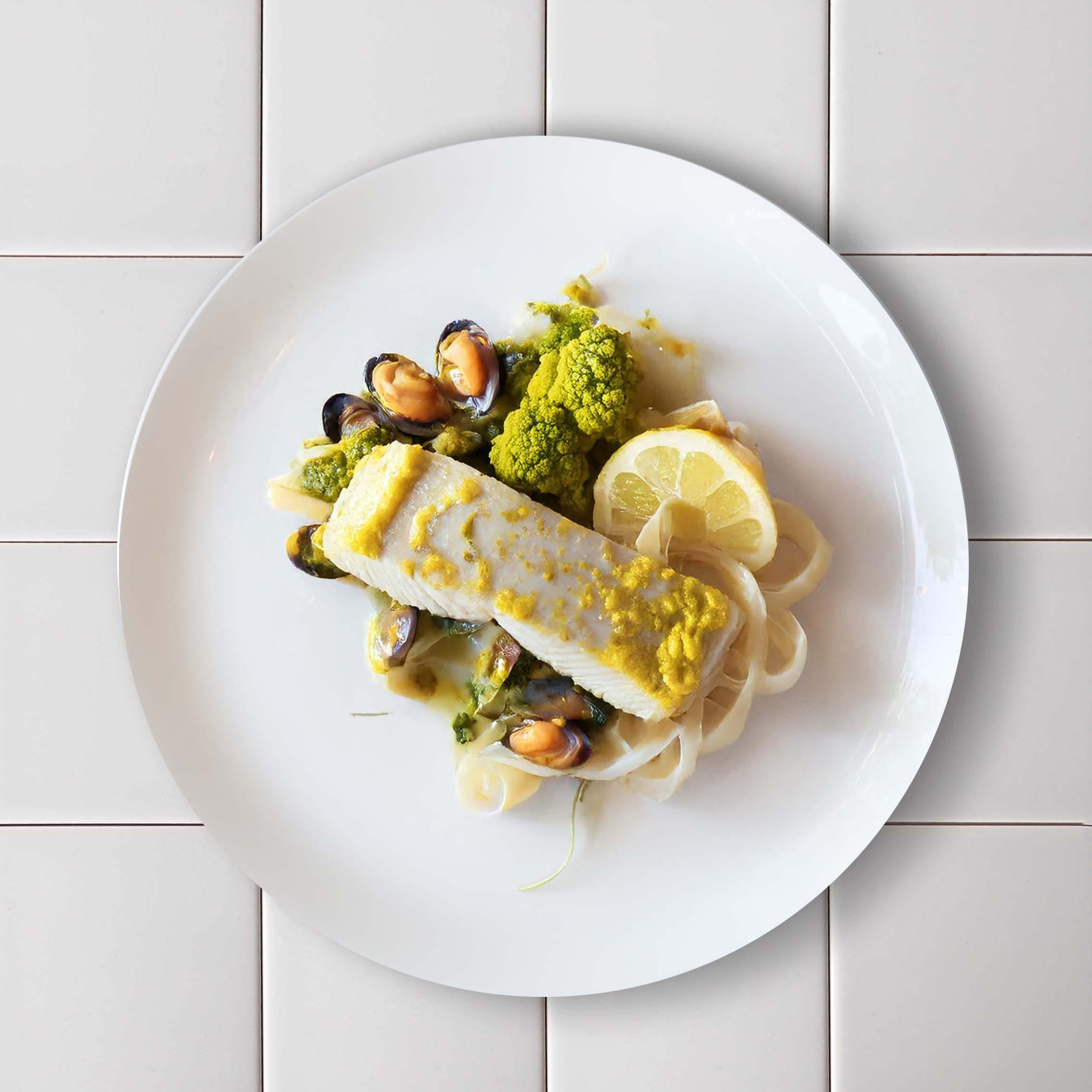 Gebakken kabeljauwfilet met saus van venusschelpen en saffraan, antiboise, posteleinstamppot en romanesco.